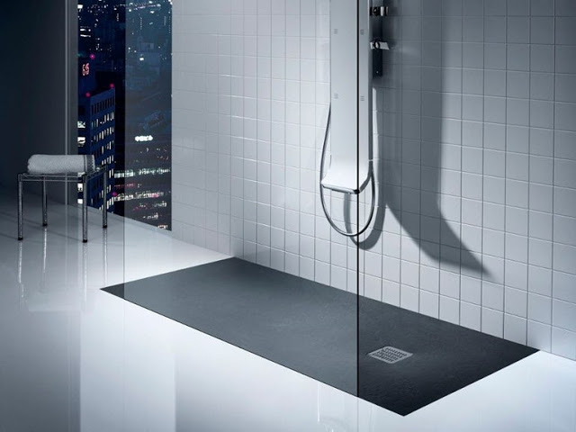 En choisissant le revêtement de la douche identique à celui des murs ou du sol de la salle de bains et des parois en verre, la pièce semble plus grande et moins encombrée.