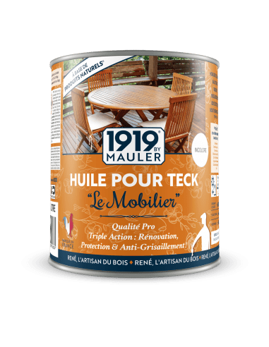 - l’huile pour teck « le mobilier » : cette huile à base de résines naturelles permet de traiter et protéger vos mobiliers de jardin en teck, ou bien d’entretenir du mobilier de jardin déjà existant (qui aura la plupart du temps grisaillé). Ainsi, elle apporte une triple action : rénovation de la couleur, protection et anti-grisaillement du support.